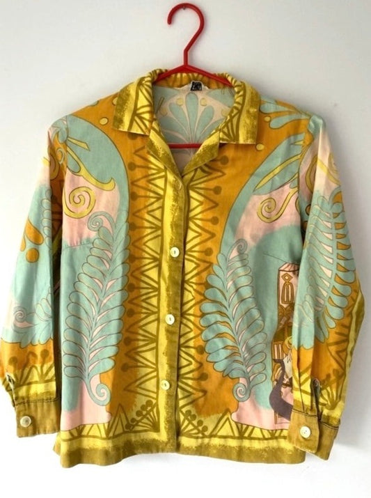 60s 70s vintage colorful handmade abstract mod sleeveless pant jumpsuit – small | disco groovy hippie collared halter pantsuit