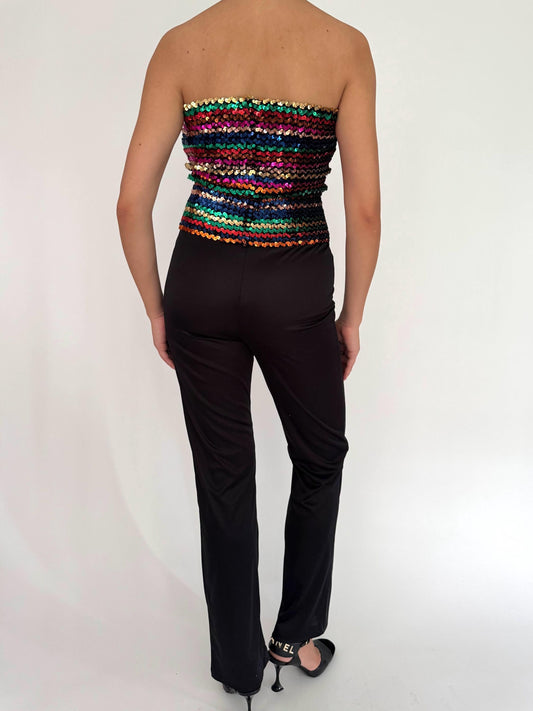 70s vintage black rainbow sequin strapless one piece jumpsuit - small medium