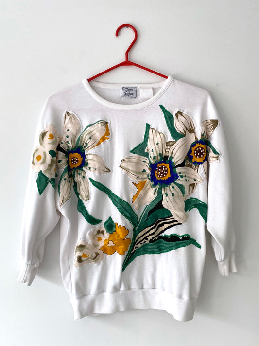 80s vintage white colorful sunflower pullover sweater – small | floral applique beaded crewneck sweatshirt