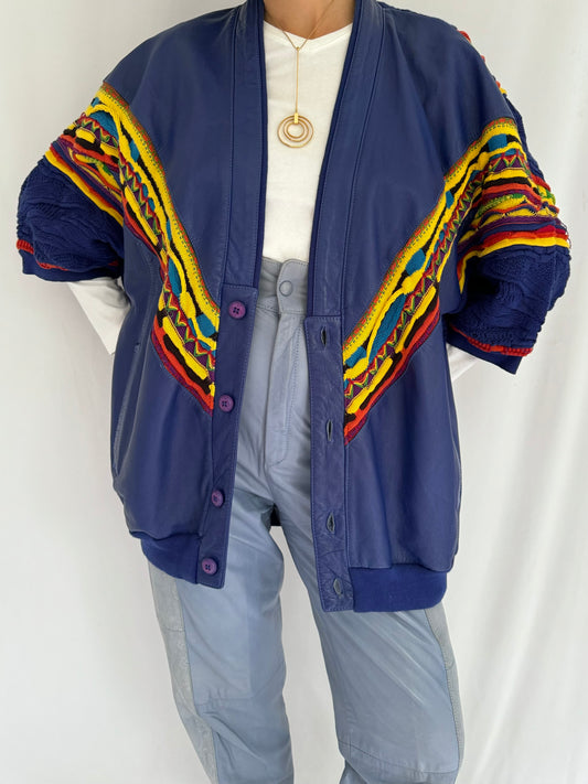 90s vintage blue coogi style leather knit button up cardigan – one size | funky crazy retro chunky sweater jacket