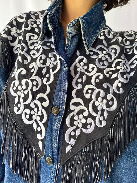 90s vintage blue denim embroidered fringed suede long button up shirt – medium, large | funky western boho collared boxy jacket