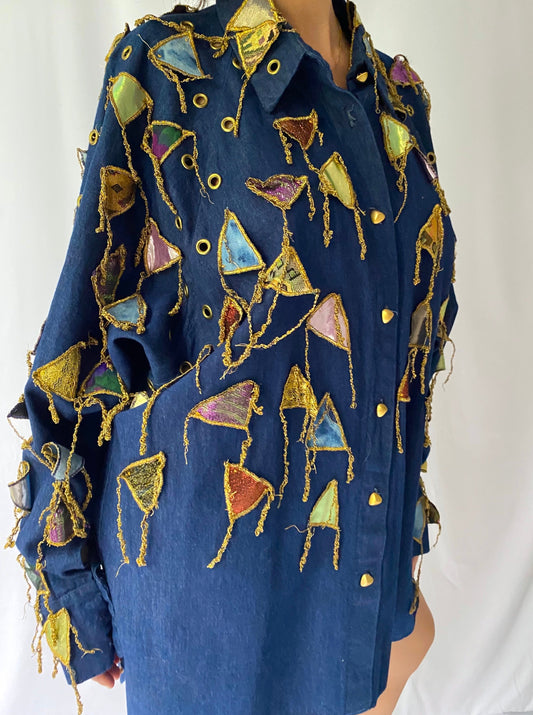 90s vintage blue denim embroidered fringe rainbow patches long shirt | funky western boho collared button up tunic