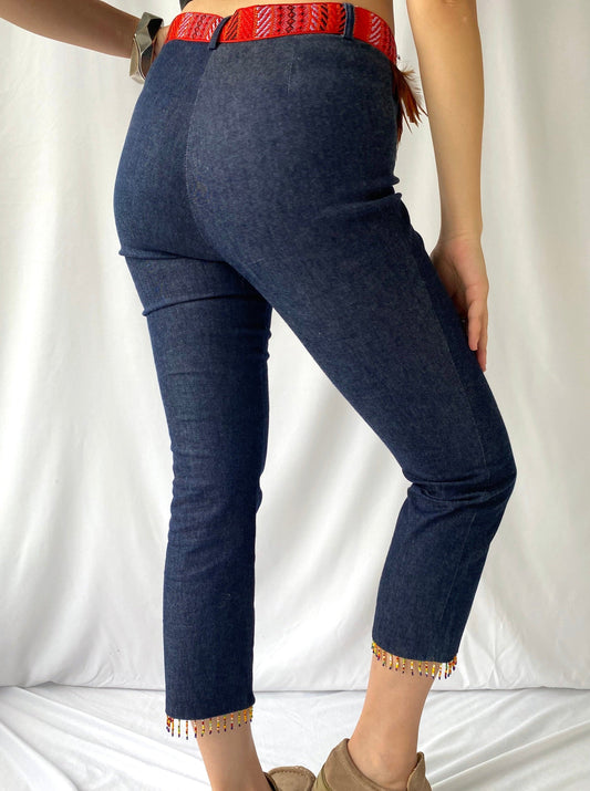 90s vintage blue denim embroidered cropped stretch pants – small, medium | funky feathers beaded fringe capris