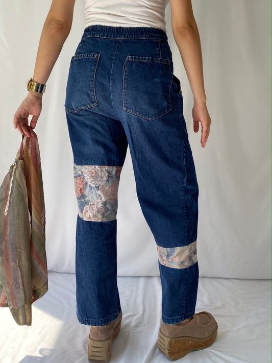 90s vintage blue denim embroidered floral patches straight wide leg pants – medium, 26 - 28” waist | unique retro baggy long jeans