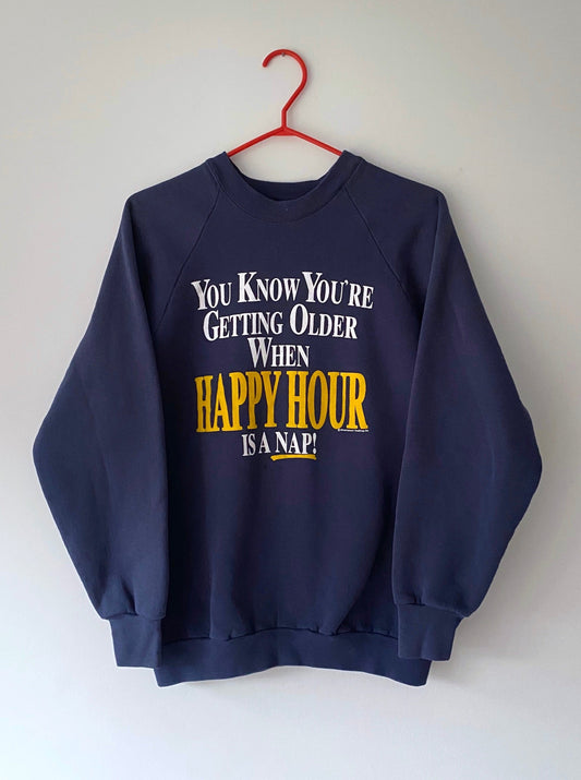90s vintage blue Getting Older humor pullover sweatshirt – medium | novelty graphic gag gift spellout crewneck sweater