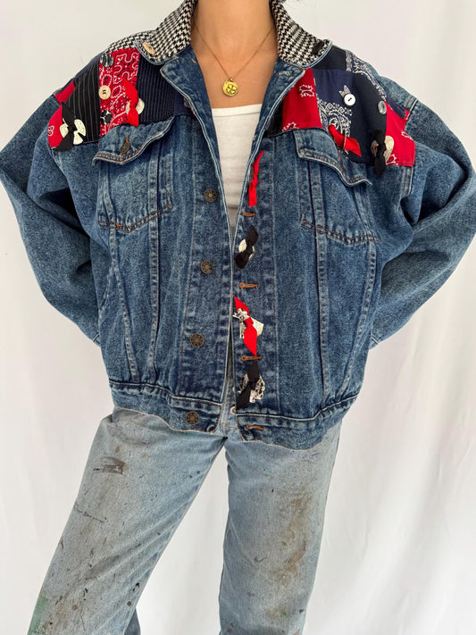 90s vintage blue denim western patchwork bandana jean jacket – medium | mixed fabrics prints medallion custom coat
