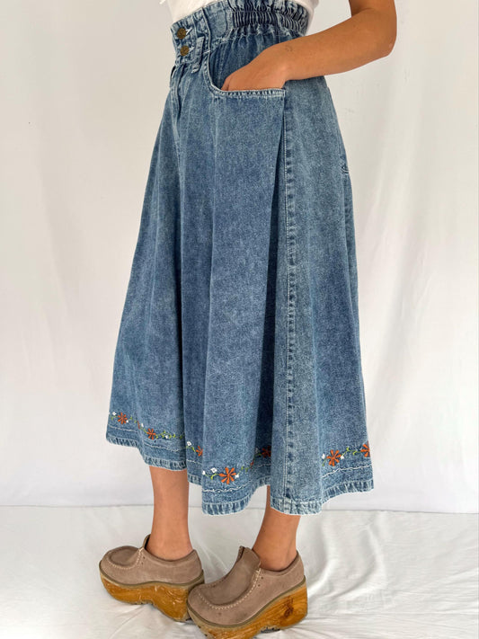 90s vintage blue denim acid wash flared jean midi skirt | floral embroidered high rise stretch elastic waist with pockets