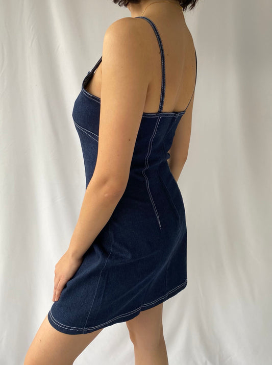 90s vintage blue denim sleeveless mini dress – medium, large | pure cotton fitted stretch jean dress