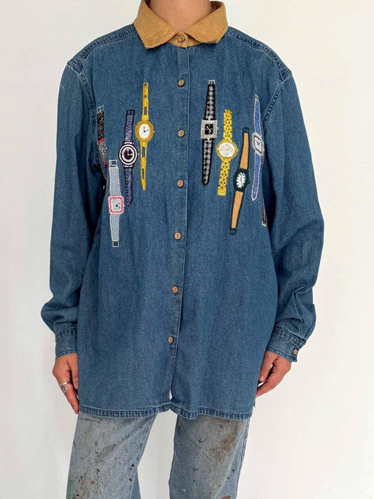 90s vintage blue denim novelty watches button up shirt – large | kitschy embroidered jean top