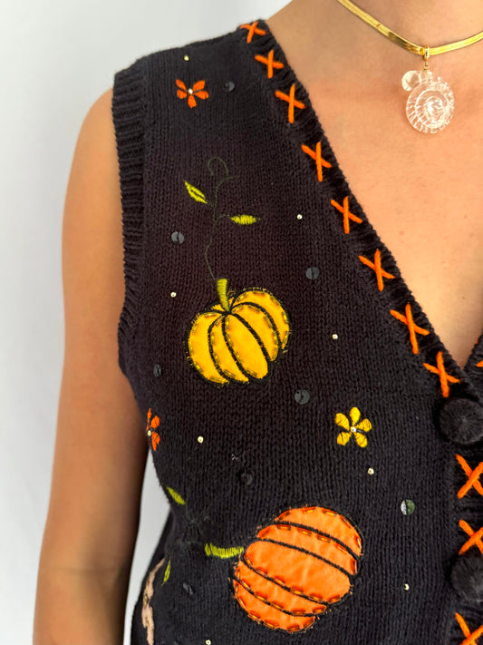 90s vintage fall pumpkin novelty knit sweater vest – medium | Halloween festive embroidered button up waistcoat