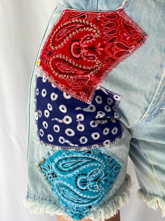 90s vintage denim patchwork cut off frayed long shorts – extra small | colorful hippy patches festival jean shorts