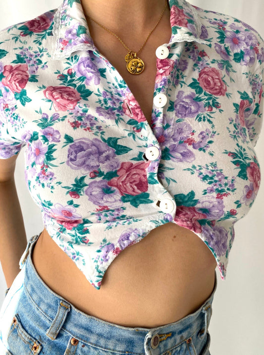 90s vintage floral collared button up crop top - extra small, small | short sleeved cute granny cropped blouse