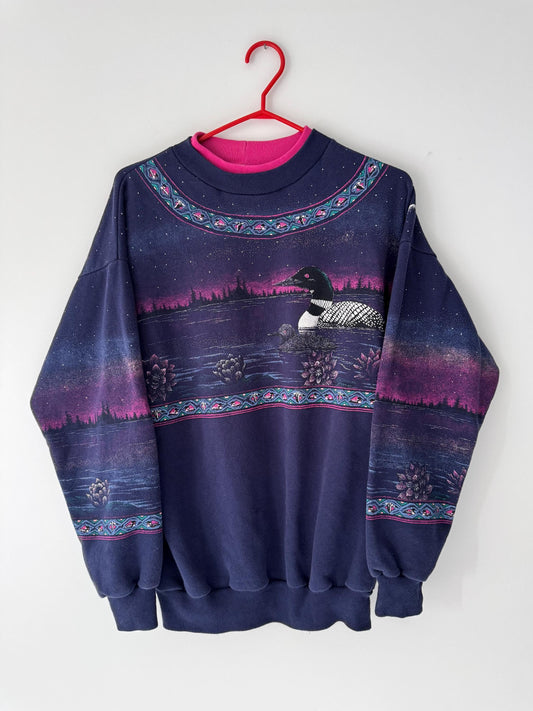 90s vintage duck loon outdoor nature graphic pullover sweater – small medium | lake landscape scene cotton collared sweatshirt