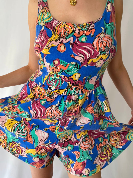 90s vintage multicolor abstract print sleeveless romper – medium | retro flared wide leg playsuit with pockets