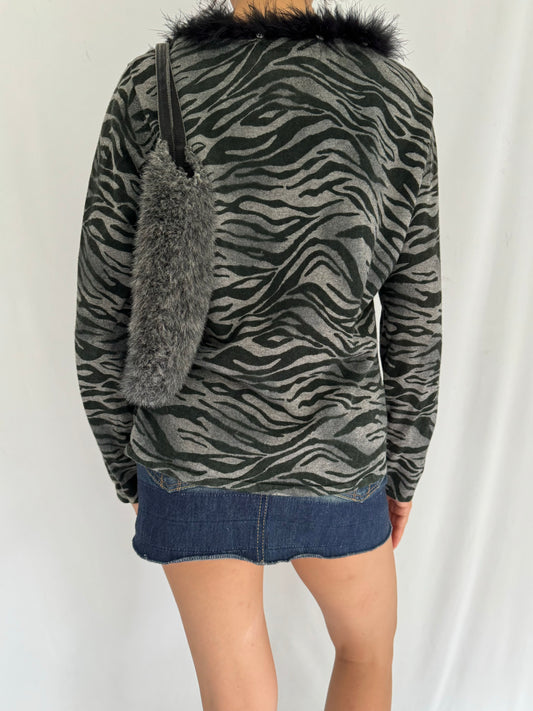 90s vintage grey zebra stripes feather trim top – medium | unique funky animal print long sleeved shirt