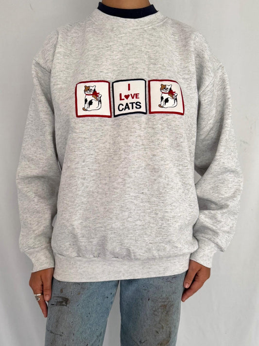 90s vintage I LOVE CATS graphic pullover sweatshirt – large | funny kittens cat lady collared sweater