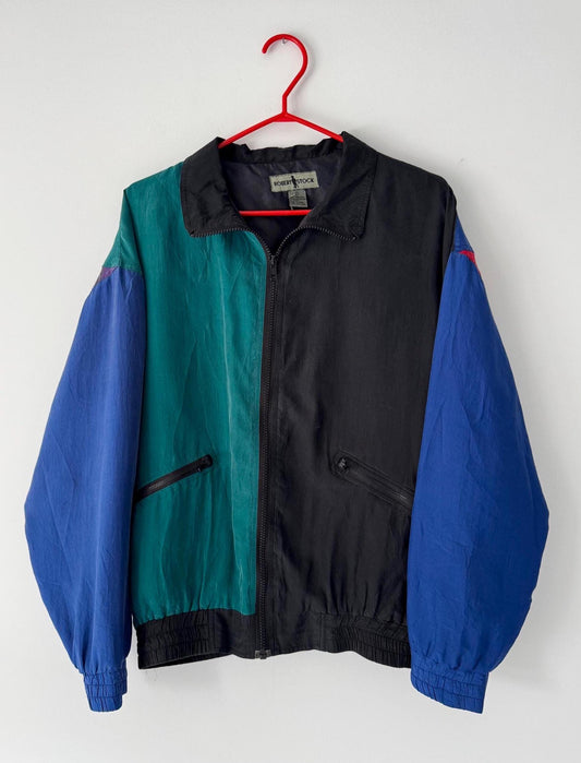 90s vintage multicolor colorblock abstract pure silk light bomber jacket | mens unisex retro graphic zip up windbreaker