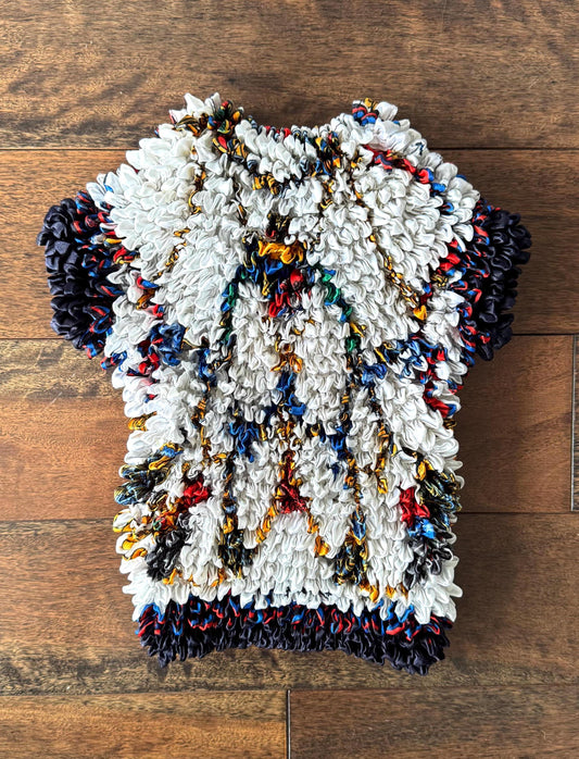 90s vintage multicolor baroque abstract print popcorn crop top | ornate funky stretchy textured crinkle scrunch stretch blouse