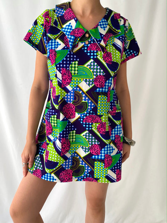 70s vintage colorful geometric short sleeved minidress – small, medium | groovy abstract retro collared dress