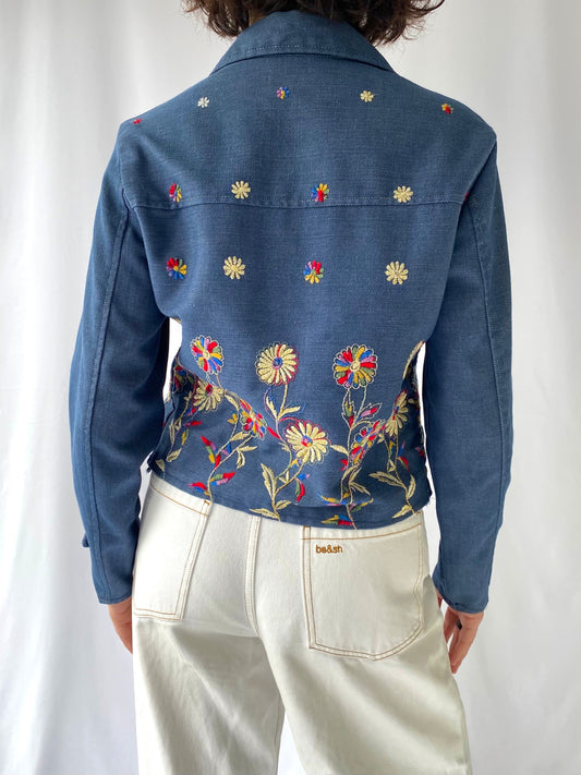 70s vintage blue denim colorful floral embroidered button up shirt – small | retro hippy flower power collared jacket