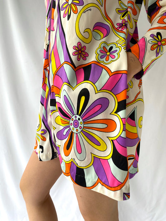 70s vintage colorful abstract groovy long sleeved mini dress – small, medium