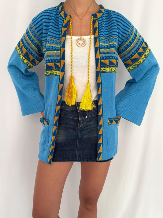 70s vintage blue yellow boho patterned open front knit cardigan – small