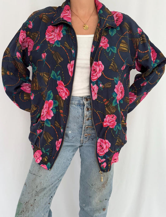 90s vintage multicolor floral rose print pure silk light bomber jacket | mens unisex basic editions novelty retro graphic zip up windbreaker