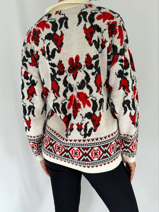90s vintage multicolor floral abstract collared knit sweater – small, medium | retro cozy winter long sleeved jumper