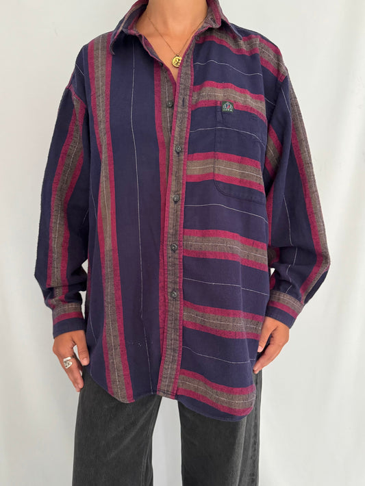 90s vintage multicolor plaid print boyfriend fit flannel button up shirt - large | unisex relaxed cotton cozy izod collared long sleeved top
