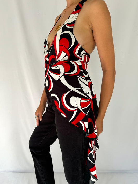 90s vintage multicolor fairy abstract print halter tank top – small medium | asymmetrical backless sleeveless shirt blouse