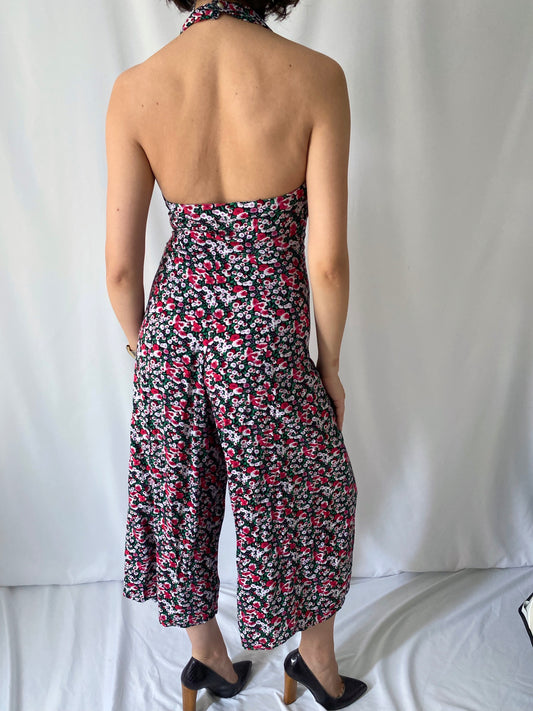 90s vintage multicolor floral pearly button up halter flared pant jumpsuit – small | cocktail dressy fitted sleeveless pantsuit