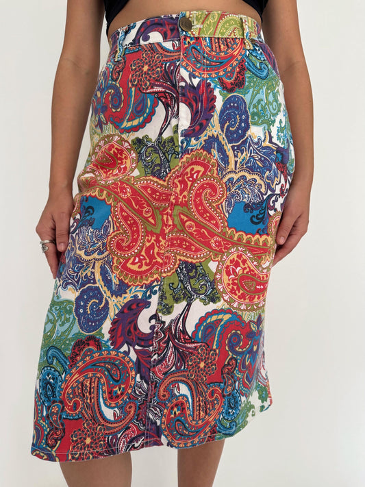 90s vintage multicolor paisley cotton long pencil skirt – medium | retro colorful casual fitted denim skirt