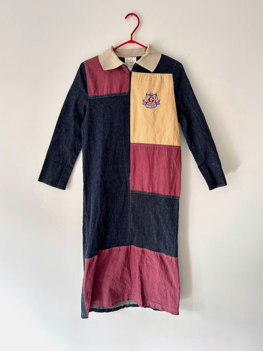 90s vintage multicolor denim patchwork midi dress – small | embroidered collared jean dress