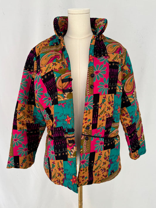 90s vintage multicolor patchwork puffy light jacket – medium | quilted silk cotton asian boho floral paisley mandarin band collared coat