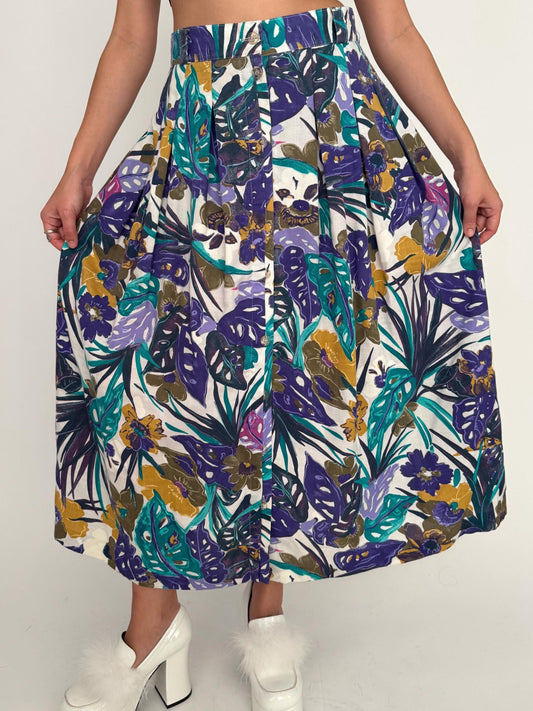90s vintage multicolor floral botanical print pleated maxi skirt – medium | retro flared button up skirt