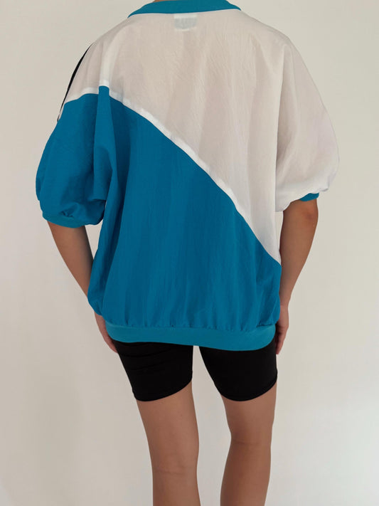 90s vintage multicolor geometric windbreaker shirt – medium | retro bright abstract slouchy blouse