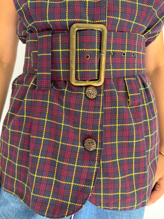 90s vintage plaid collared belted button up vest – small, medium | preppy uniform dark academia sleeveless waistcoat