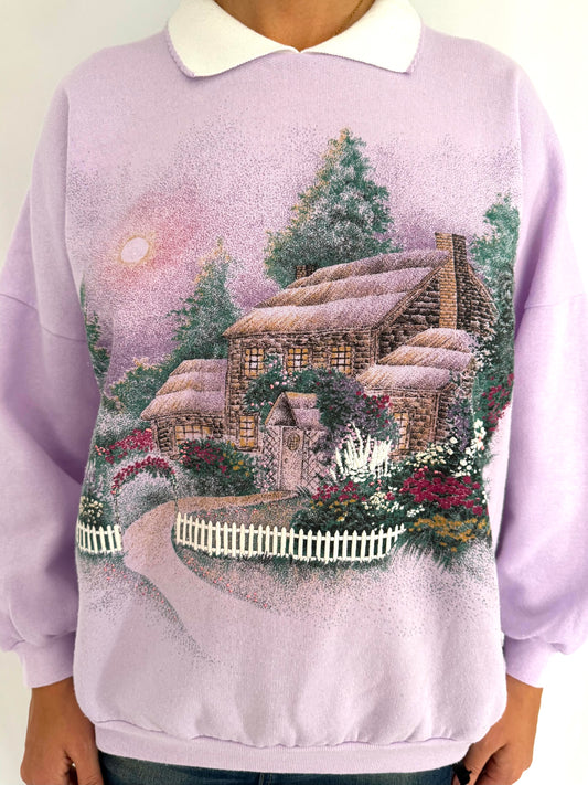 90s vintage purple outdoor country garden scene pullover sweatshirt – small medium | cute granny graphic puffy collared sweater