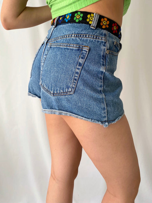 90s vintage rainbow groovy mini blue denim cutoff shorts – small | hippy flower power retro high waist short jeans