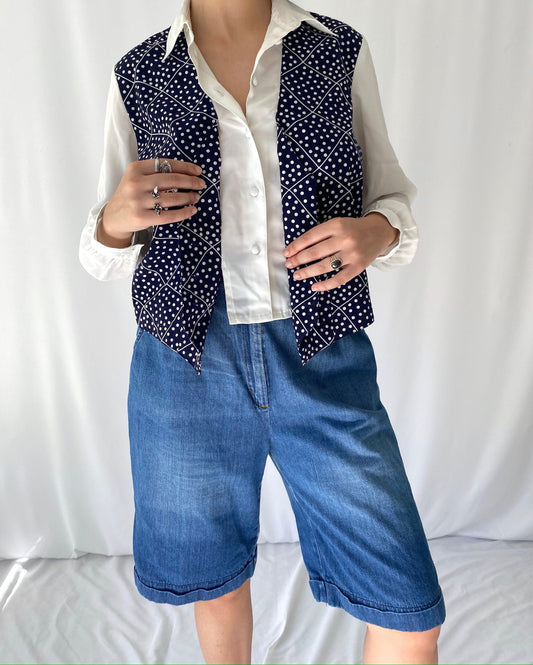 90s vintage polka dot navy blue white attached vest blouse – small | novelty retro layered collared button up shirt