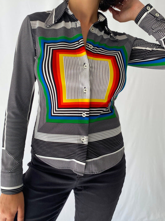 90s vintage rainbow abstract geometric long sleeved blouse – extra small, small | miss sixty colorful collared button up shirt, made in italy