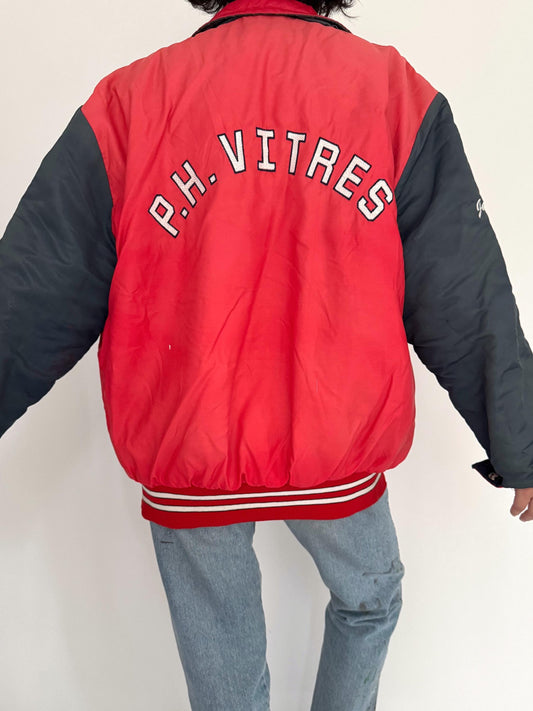 90s vintage red blue spellout puffy bomber jacket – medium | made in Canada faded snap button jacket