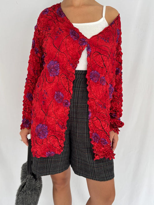 90s vintage red floral print cute ugly popcorn blouse cardigan | one size funky textured stretchy light button up top