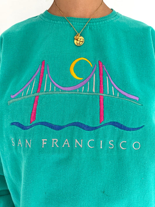 90s vintage teal san francisco retro graphic pullover sweater | unisex california travel souvenir golden gate bridge crewneck sweatshirt