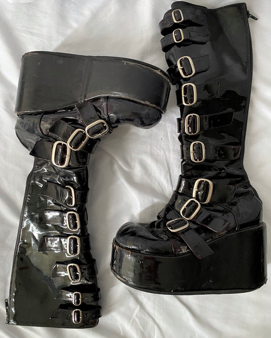 90s vintage shiny black patent demonia platform boots - womens size 7.5 | punk goth cosplay grunge buckle wedges