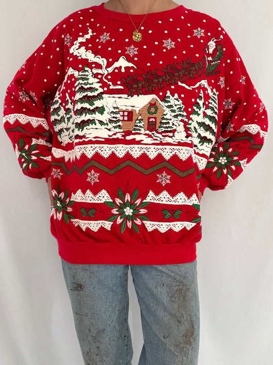 90s vintage red snowy winter scene graphic pullover sweatshirt – large | christmas reindeer holiday outdoor snow crewneck sweater