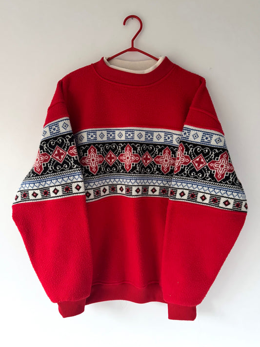 90s vintage red nordic aztec print fleece knit pullover sweater - large | unisex mens retro winter apres ski fair isle crewneck sweatshirt