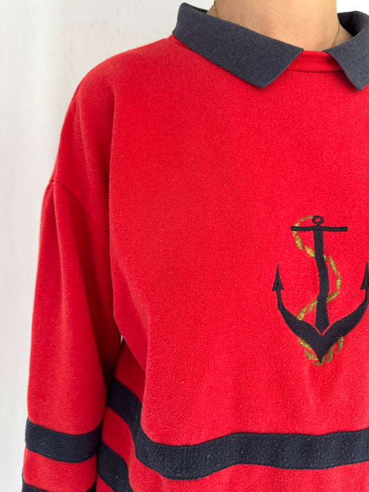90s vintage red navy nautical anchor graphic pullover sweater – small, medium | sailing print long sleeved collared sweatshirt