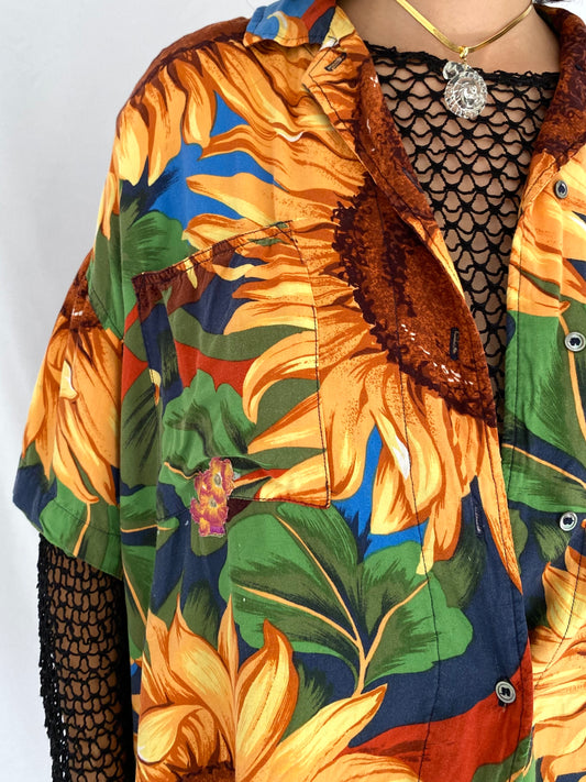 90s vintage sunflower print button up blouse – medium, large | flowers nature collared half sleeved shirt