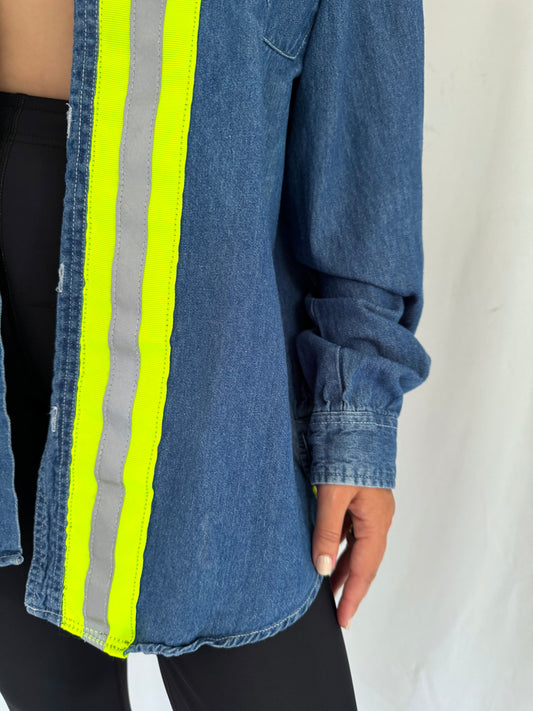 90s vintage reworked hi vis stripes blue denim button up shirt – medium | unisex unique reflective long sleeved blouse